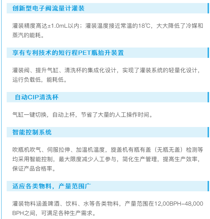 The Zhongchen Light Machinery one-step blowing, filling and capping machine products have been successfully put into operation at the sites of Hangzhou Water Authority Group, Tianfu Cola, Heineken Group, PepsiCo, Danone and other customers, and have received unanimous praise from customers. The blowing, filling and capping machine series adopts advanced electronic valve flowmeter filling as the main method, which greatly improves the filling temperature and liquid level accuracy and reduces the production cost of customers. Especially for PepsiCo and F&N Group, they have successfully put the machine into operation and completed the acceptance in the background of the epidemic through remote service, and have been able to produce stably for two years at a 7X24 high-load production capacity.