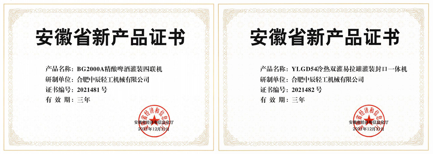Recently, the results of the 2021 Anhui Province New Product (Fourth Batch) Identification were announced, and the "BG2000A Craft Beer Bottling Four-in-One Machine" and "YLGD54 Cold and Hot Double-fill Easy Can Filling and Sealing Integrated Machine" independently developed by Hefei Zhongcheng Light Machinery passed the Anhui Province New Product Identification.