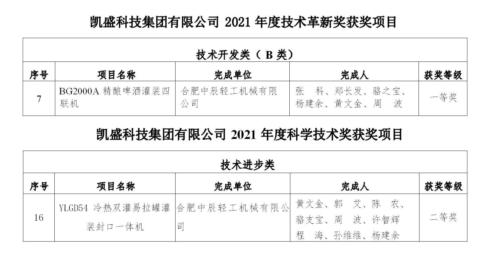 Recently, the 2021 annual KaiSheng Science and Technology Group Science and Technology Award selection results were publicly announced. After the initial material submission and online presentation, the two achievements submitted by Hefei ZhongChen Light Machinery Co., Ltd. passed the expert review at the appraisal meeting and both won prestigious awards. Among them, "BG2000A Precision Brewing Beer Filling Four-in-one Machine" won the first prize in the technical innovation award category (B type) for technological development, and "YLGD54 Cold and Hot Double-fill Easy Can Filling and Sealing Integration" won the second prize in the science and technology award category for technological progress.