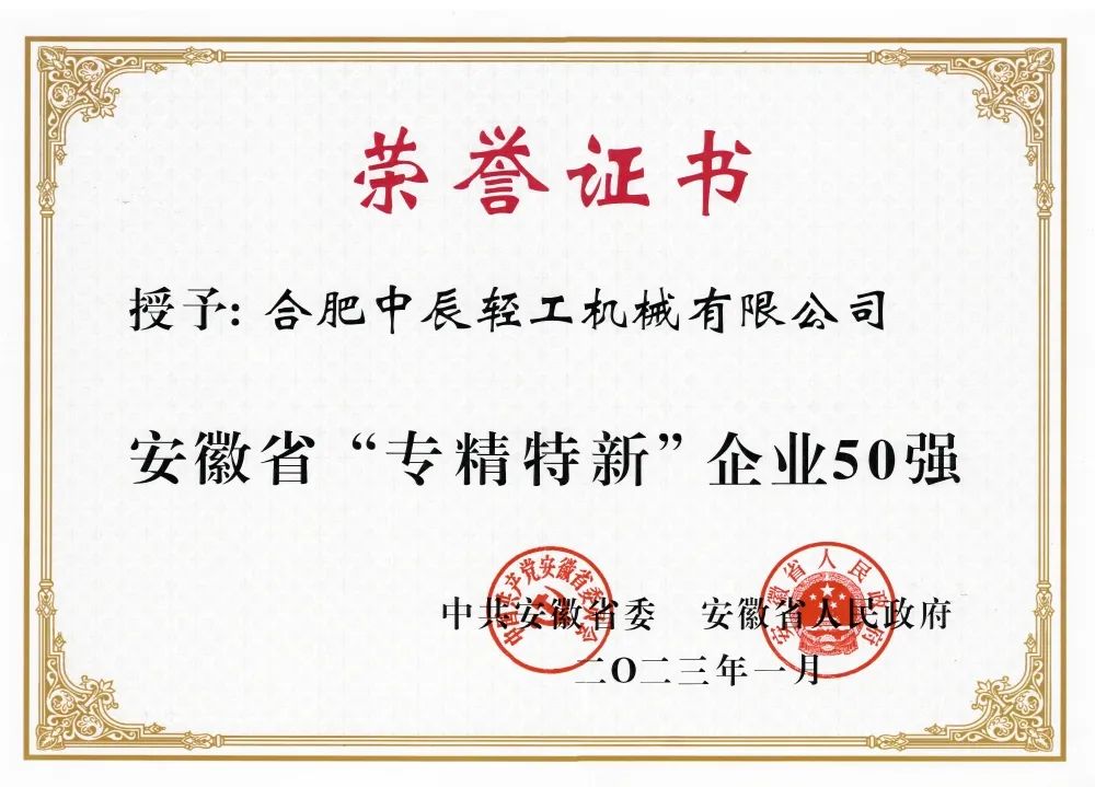It is an honor for Zhongchen Light Industry to be named one of the top 50 "specialized, innovative, and feature-rich" enterprises in Anhui Province and receive commendation from the CPC Anhui Provincial Committee and the Anhui Provincial People's Government. Zhongchen Light Industry feels that this honor is invaluable and that its mission is both glorious and arduous. In 2023, Zhongchen Light Industry will redouble its efforts and fully demonstrate the exemplary role of the top 50 "specialized, innovative, and feature-rich" enterprises in Anhui Province to unleash powerful momentum. Zhongchen Light Industry will continue to benchmark against the best and be bold in innovation, striving to achieve better quality, higher efficiency, stronger competitiveness, and greater influence, thereby making new contributions to the high-quality development of Anhui's economy and society.