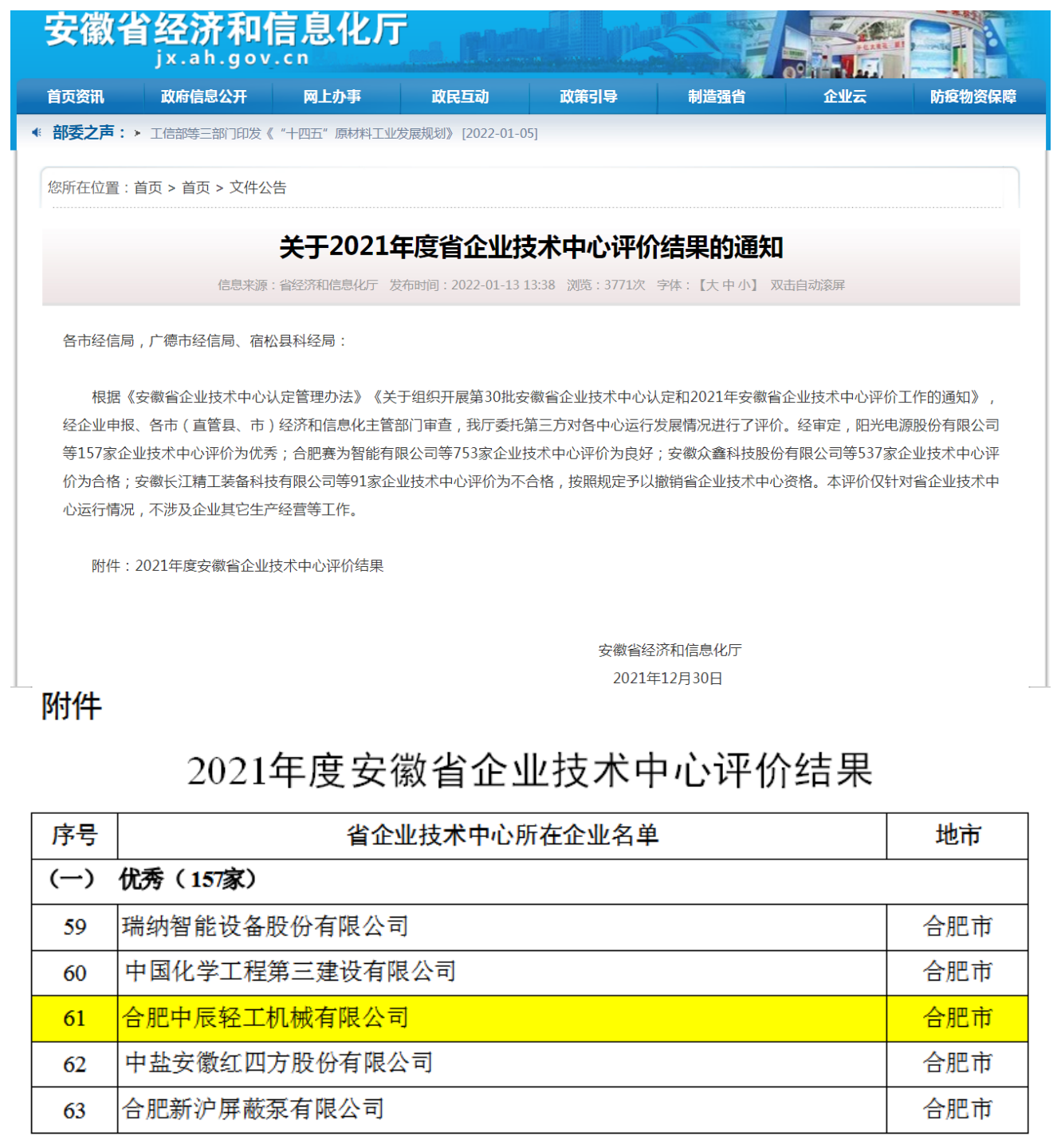 On December 30, 2021, the Anhui Provincial Department of Economy and Information Technology released the "Notice on the Evaluation Results of Anhui Provincial Enterprise Technology Center in 2021". Zhongchen Light Machinery stood out among the 1538 participating enterprises in the province and was named "Anhui Province Excellent Enterprise Technology Center". Only 157 enterprises were selected...